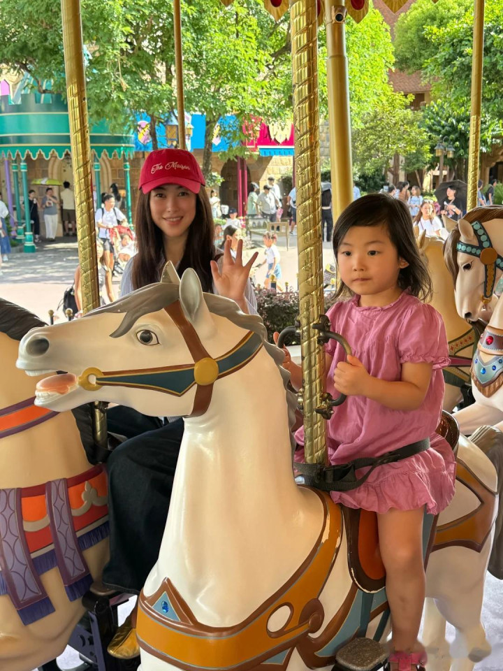 在乐园里,朱珠还给女儿租了辆推车,4岁的王珠宝身穿粉色连衣裙,留着一头黑色短发,看起来非常乖巧。